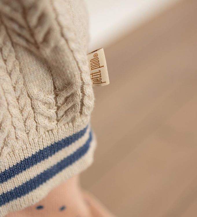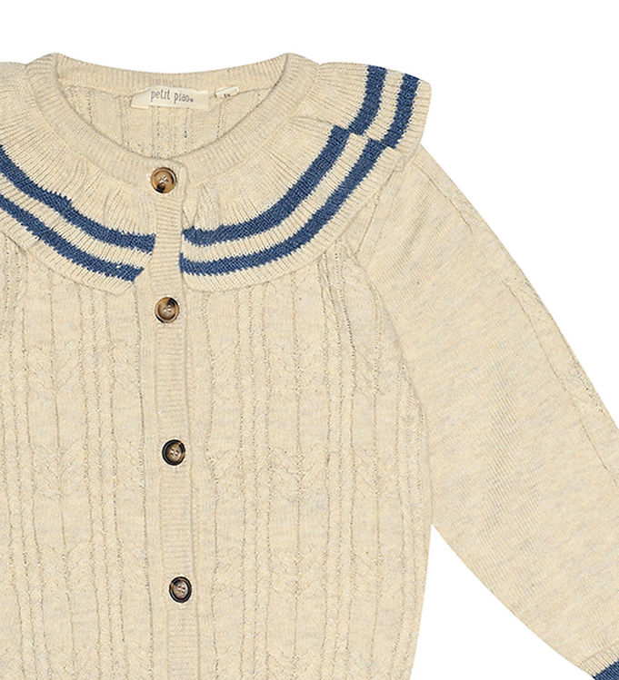 Fineste Petit Piao cardigan i meleret beige strik, med en fin mønsterstruktur. I halsen er der en bred flæse og i arm- og taljeåbningerne samt på flæsen i halsen er der to smalle, blå striber.