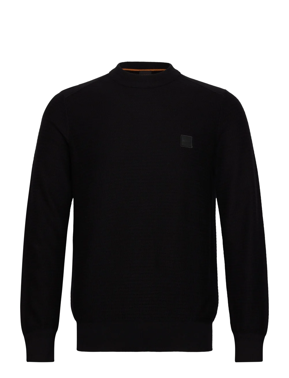 Super flot mønster striktrøje i bedste Hugo Boss kvalitet. Regular fit som giver dig en lettere slank facon uden dog at være slim fit. Med Boss logo på brystet samt rib-kant ved både talje og håndled. Farve: Sort. Fremstillet i 95% bomuld, 5% cashmere.