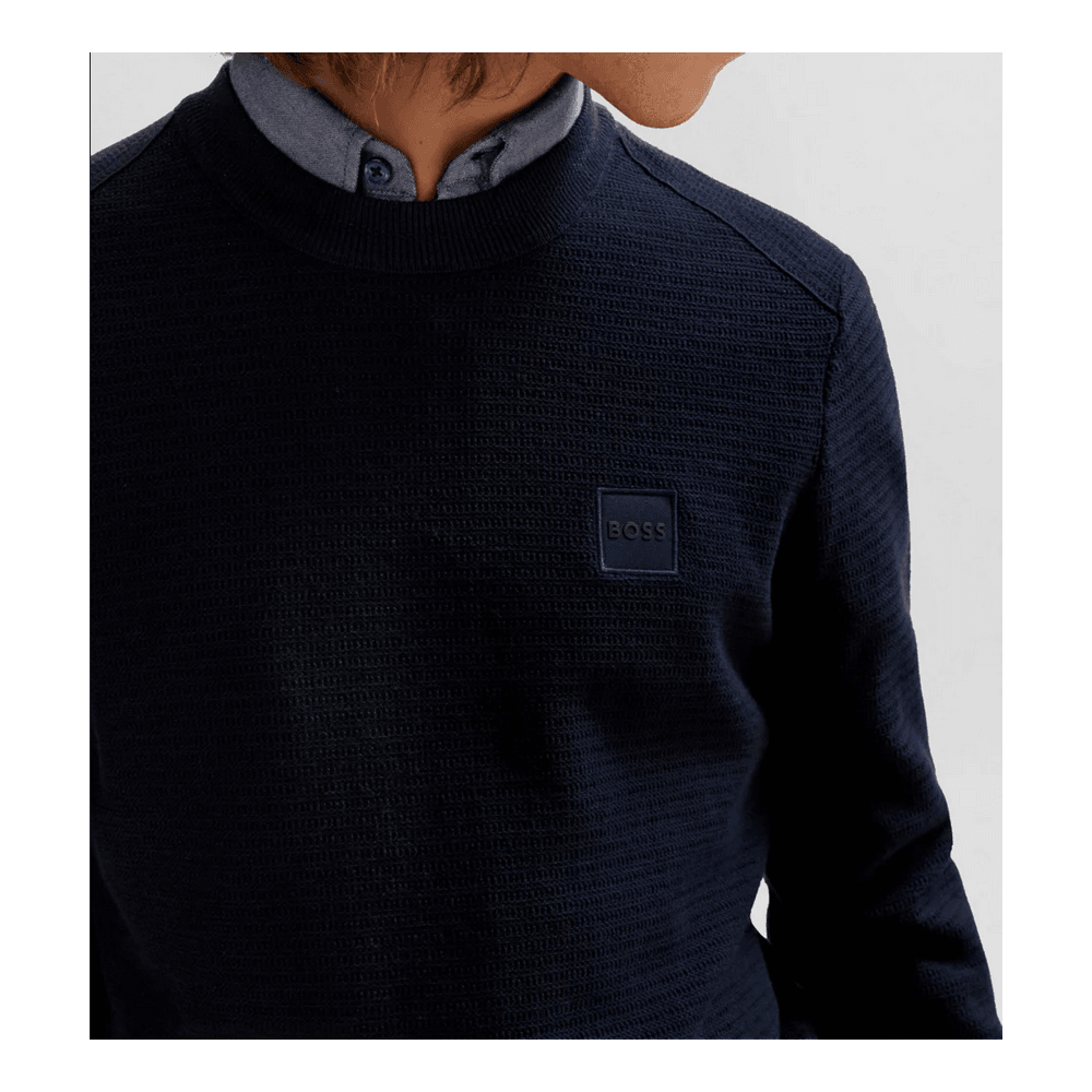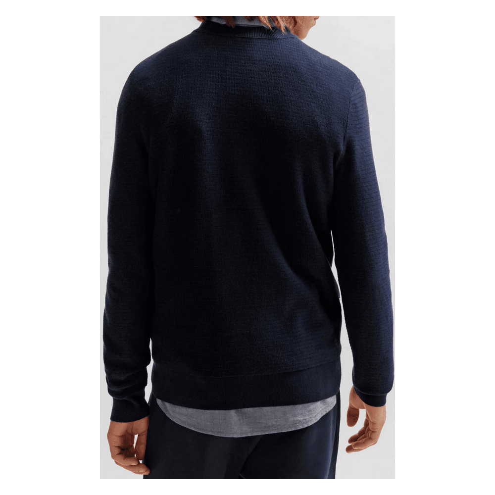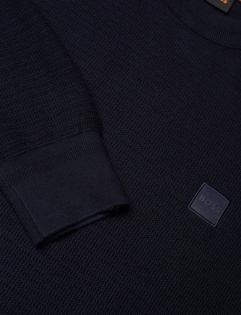 Super flot mønster striktrøje i bedste Hugo Boss kvalitet. Regular fit som giver dig en lettere slank facon uden dog at være slim fit. Med Boss logo på brystet samt rib-kant ved både talje og håndled. Farve: Dark Blue. Fremstillet i 95% bomuld, 5% cashmere.