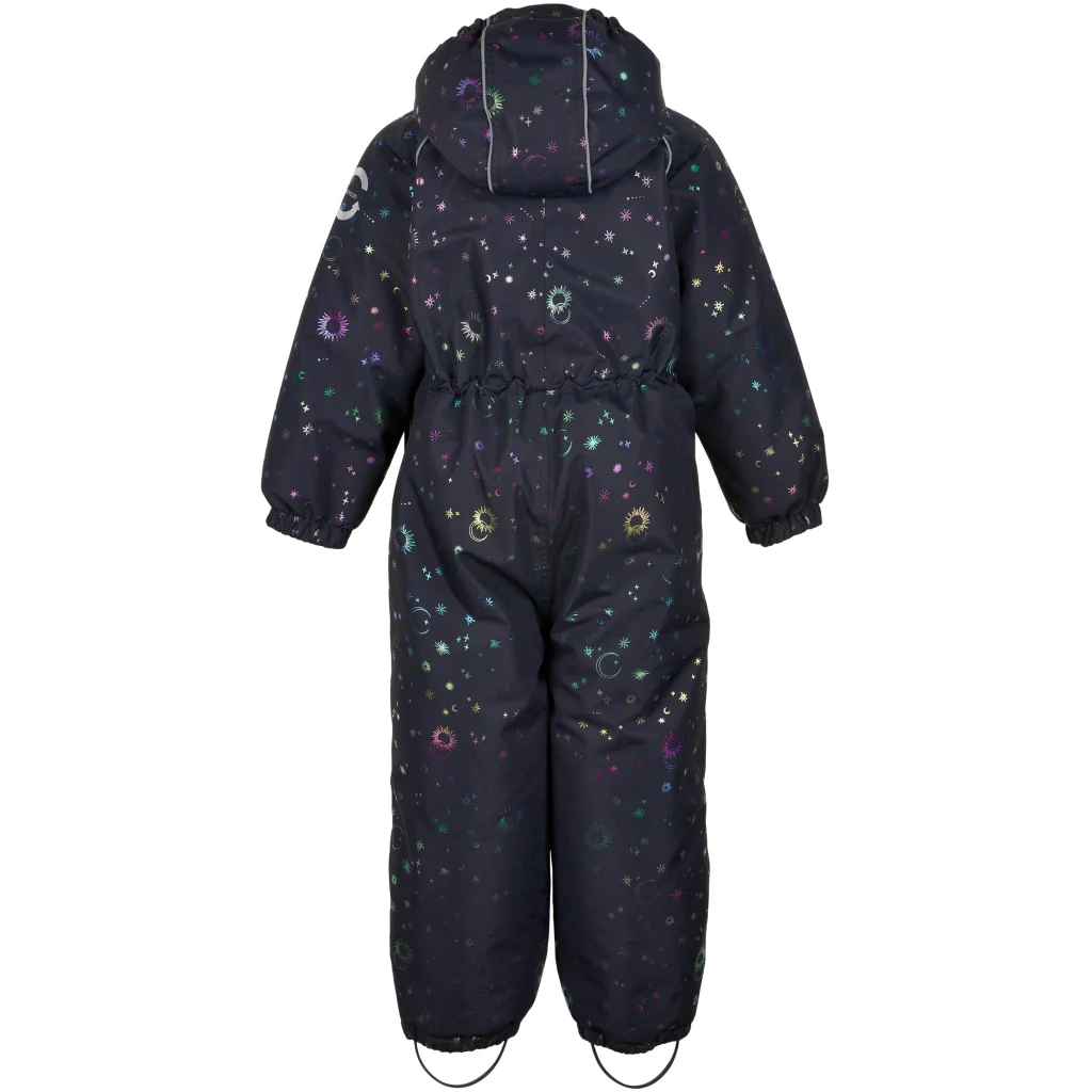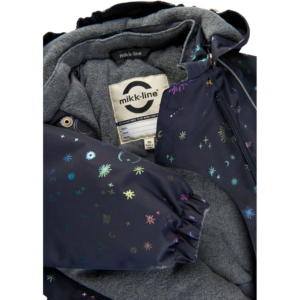 Mikk-line flyverdragt med et farverigt glitterprint af stjerner og måner. I denne lækre flyverdragt kan barnet lege og udforske naturen under den åbne himmel i alt slags vejr i løbet af de kolde og våde efterår- og vintermåneder. Flyverdragten er lavet af genanvendt polyester og polstret med polyesterfyld. Hætten og overkroppen har blødt fleece foer, hvorimod ærmerne og benene har en glat og gnidningsfri indvendig overflade. Vi har anvendt Solution Dye til farvning af det glatte for, da det bl.a. mindsker forbruget af vand i produktionen. Den er naturligvis også fluorfri med BIONIC-FINISH® ECO imprægnering.