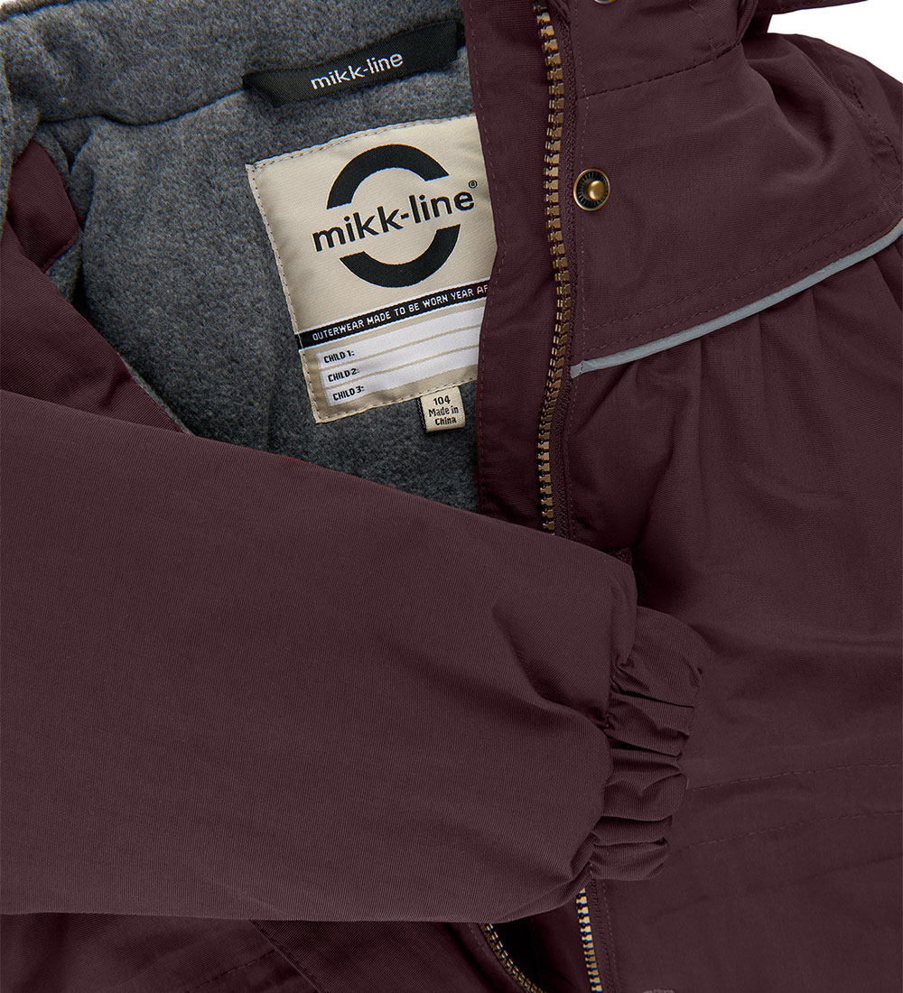 Mikk-Line vinterjakken har en aftagelig hætte, som fæstnes langs den mellemhøje halskrave med trykknapper. Hætten har elastikkanter i siderne. Ærmerne har fleeceforede elastikkanter i åbningerne.