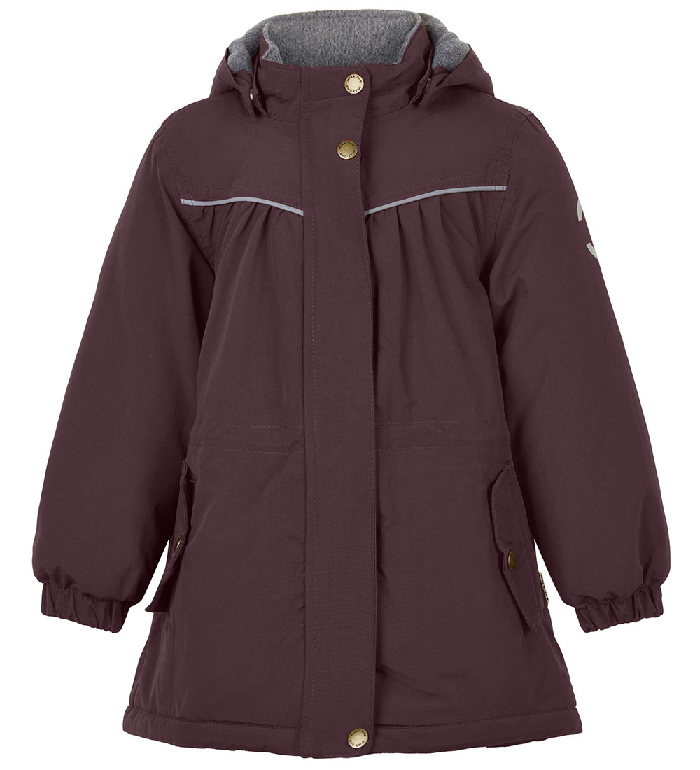 Skøn Mikk-Line vinterjakke i mørk lilla med reflekslogoer og -pipings.