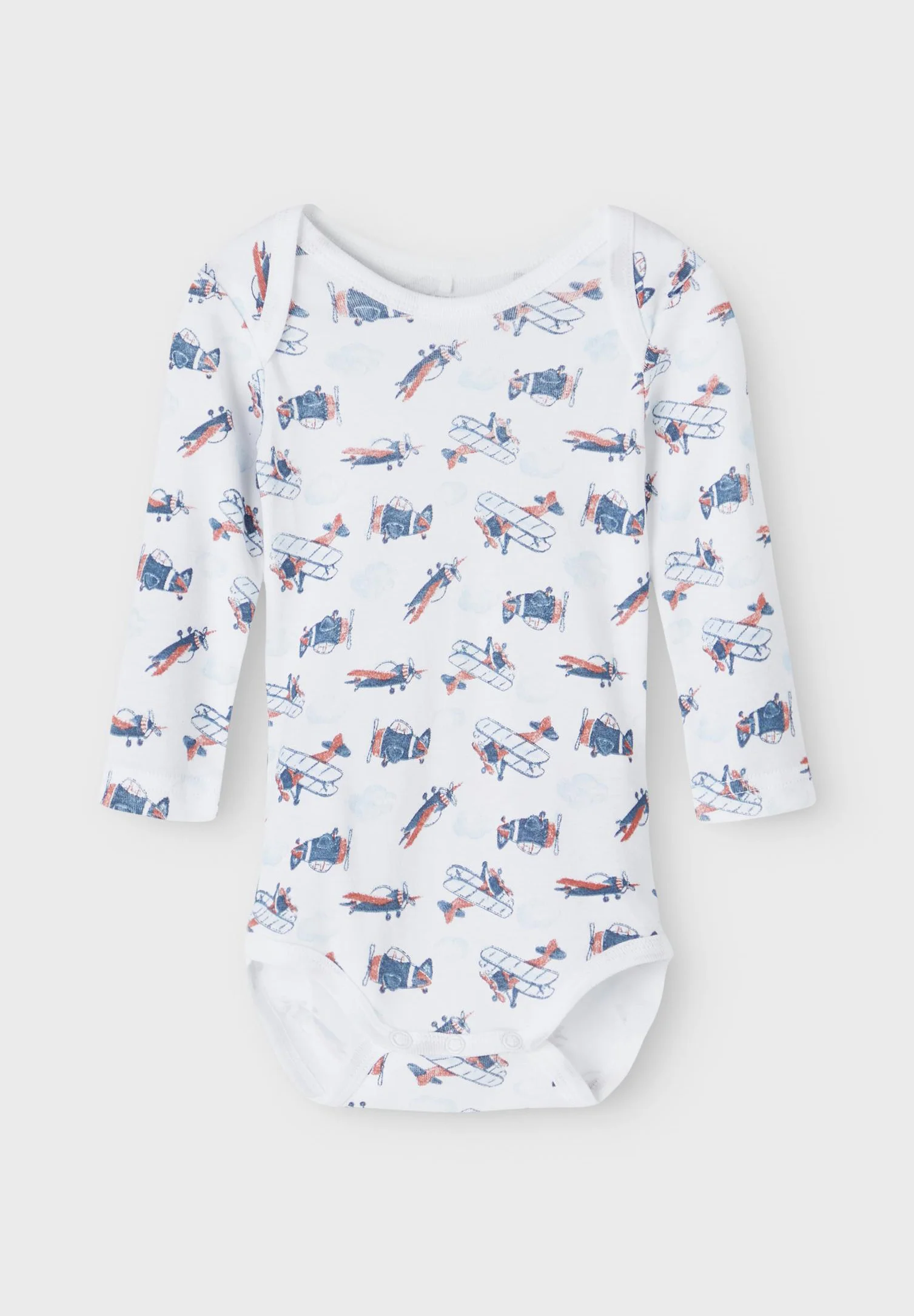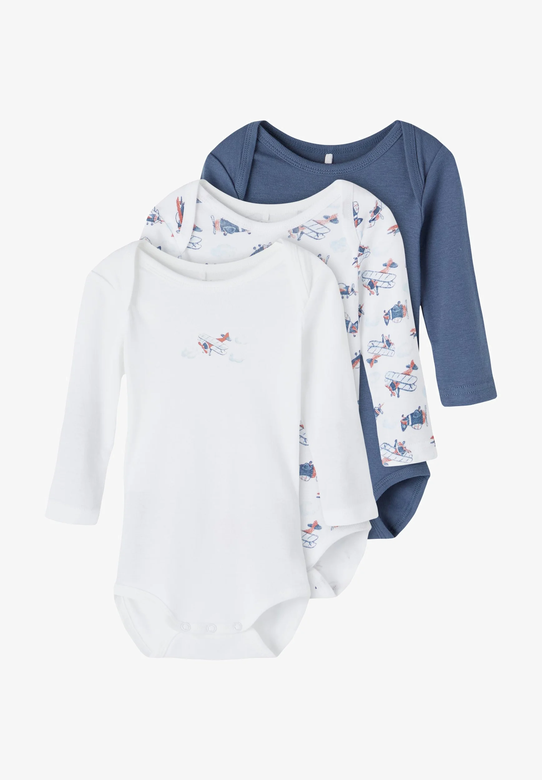 Name It bodyerne har lange ærmer og smalle kanter i alle åbninger. I halsåbningen er der praktiske foldeskuldre. Bodyerne kan åbnes mellem benene med tre trykknapper.
