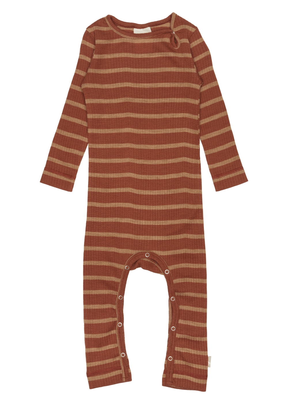Lækker Petit Piao heldragt med en fin ribstruktur. Petit Piao blusen har lange ærmer og en smal ribkant i halsåbningen. Blusen åbnes ved venstre skulder med en trykknap, og den er lavet i en skøn uldkvalitet. Farve : Rust/Cream. Fremstillet i 100% Merino uld.