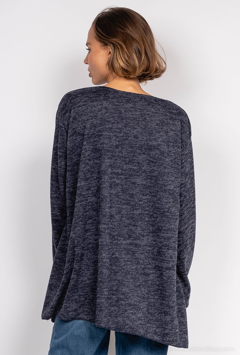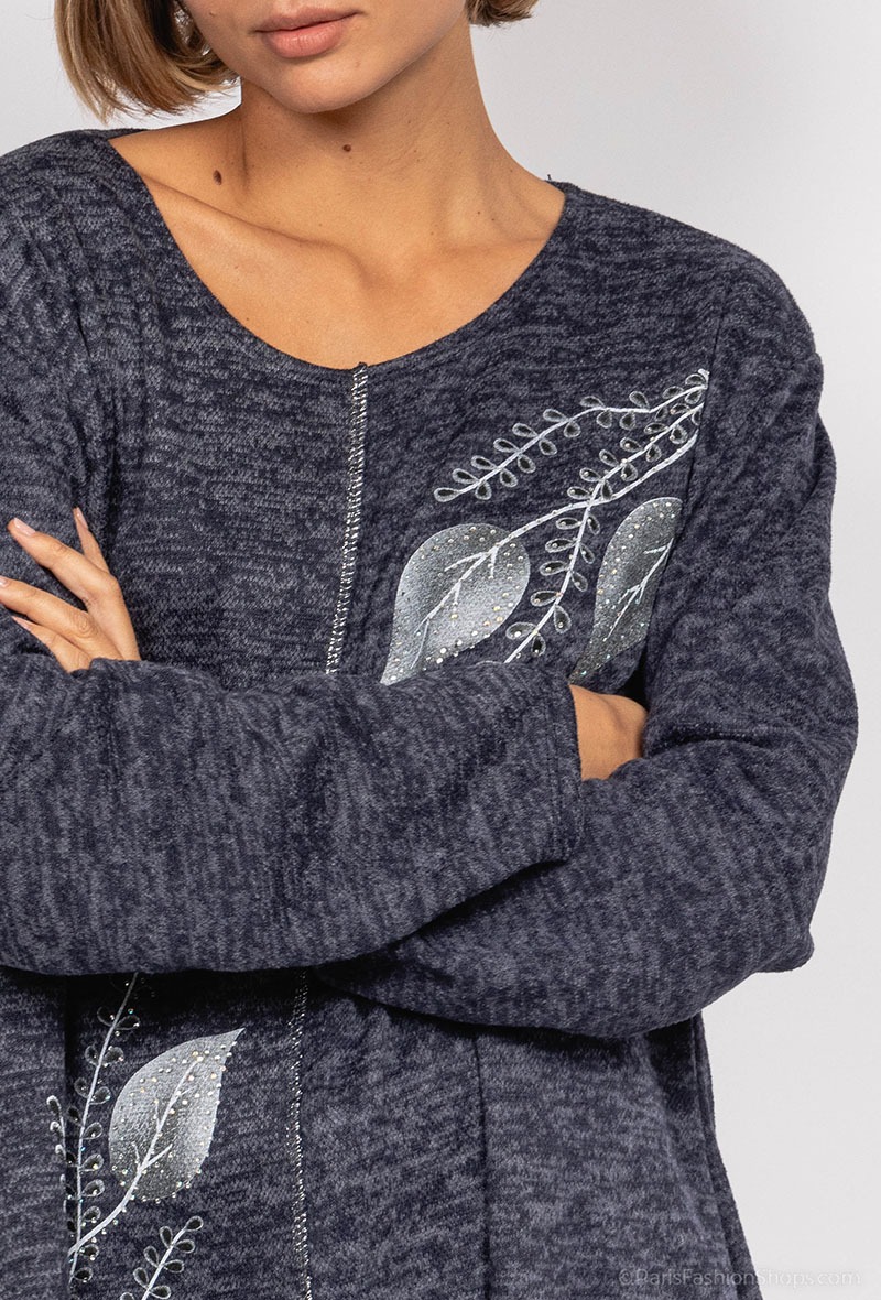 Smart og løstsiddende sweater i dejlig blød kvalitet. Med fine motiver. Farve : Navy. Fremstillet i 40% viscose, 30% uld, 30% polyamid.