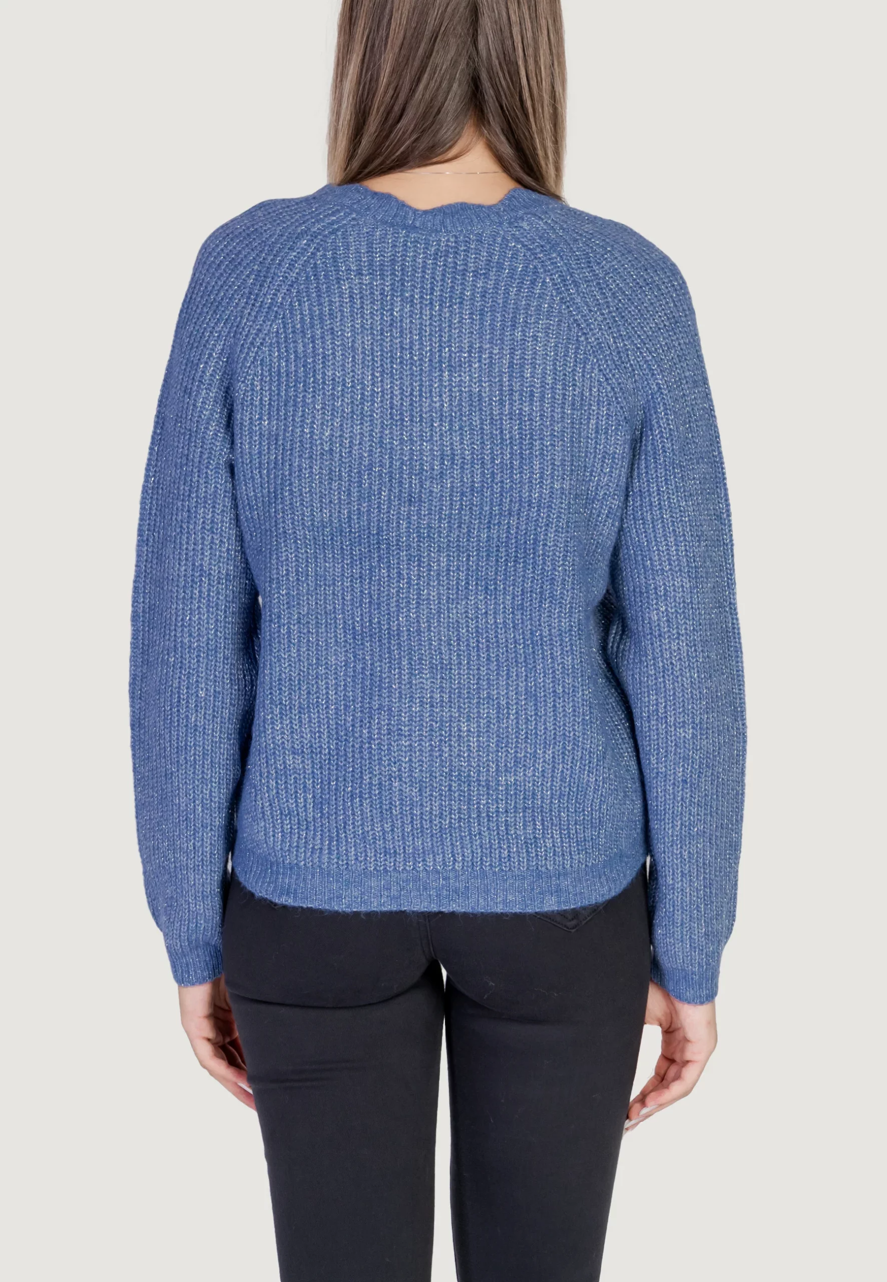 Smart strik cardigan i bedste Vila kvalitet. Farve: Bijou Blue/Silver. Fremstillet i 50% Recycled Polyester, 25% Polyamide, 20% Acrylic, 5% Polyester.