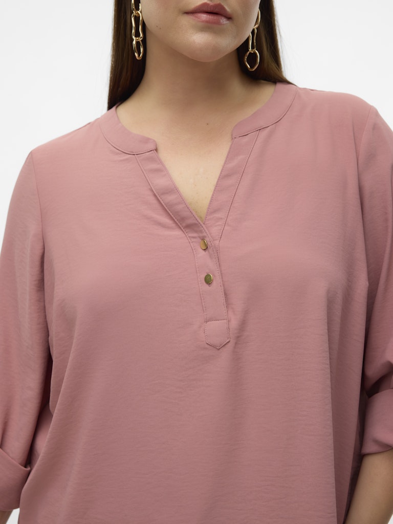 Knapdetalje, Længere bagpå og kortere foran. Manchetter med opsmøg, V-hals.